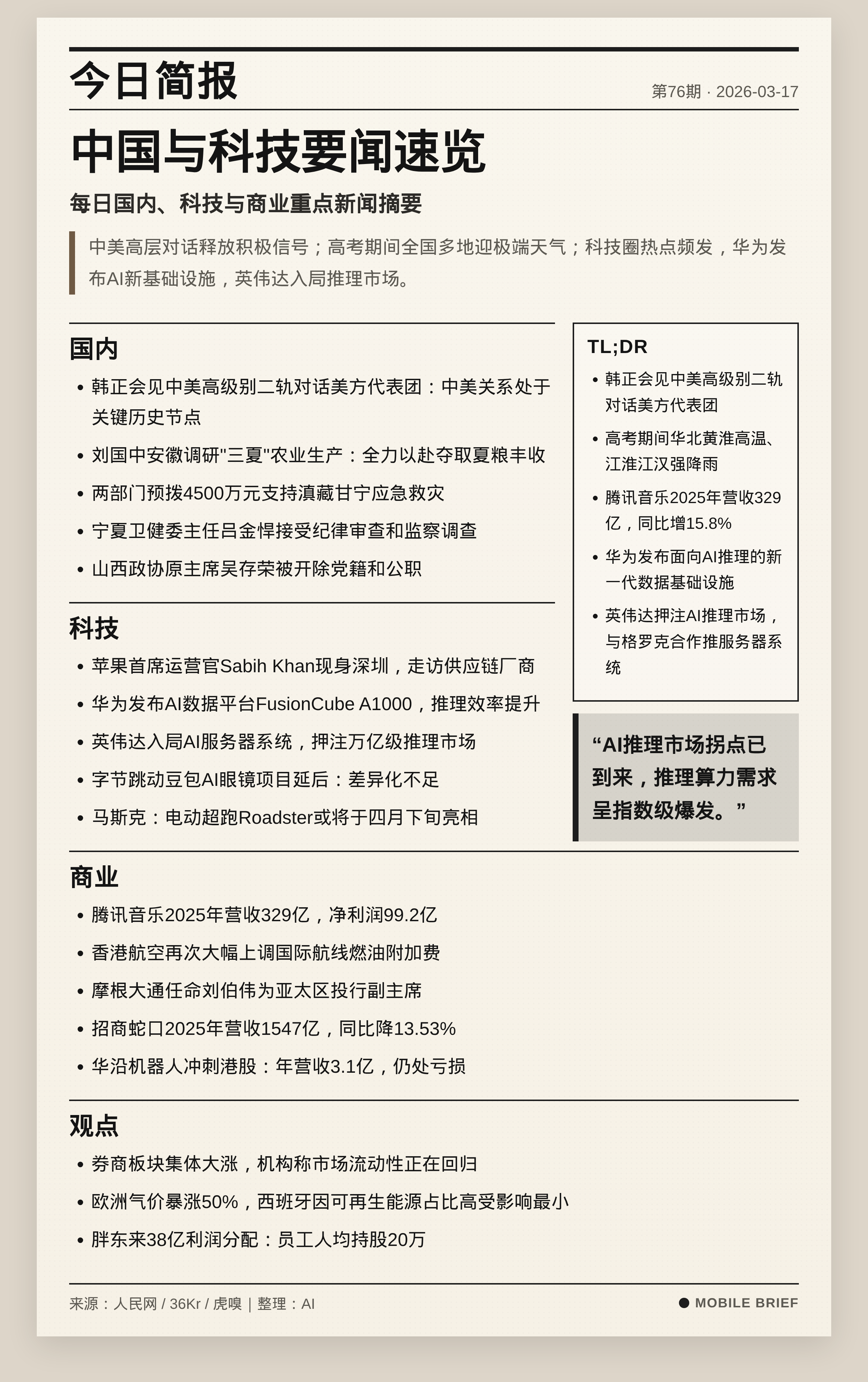 前段时间在树莓派上部署了OpenClaw,于是想能否让他帮忙完成这件事,于是就有了这篇学习笔记。下图展示了2026-03-17的新闻简报: